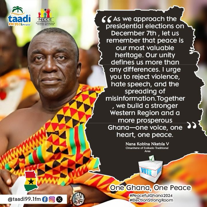 Taadi FM, known for its strong commitment to community development, business, and culture, has become a trusted platform for fostering dialogue and promoting local values. With its focus on engaging local voices and celebrating the rich heritage of the Western Region, the station is using its influential presence to encourage peaceful conduct among citizens during this critical electoral period.